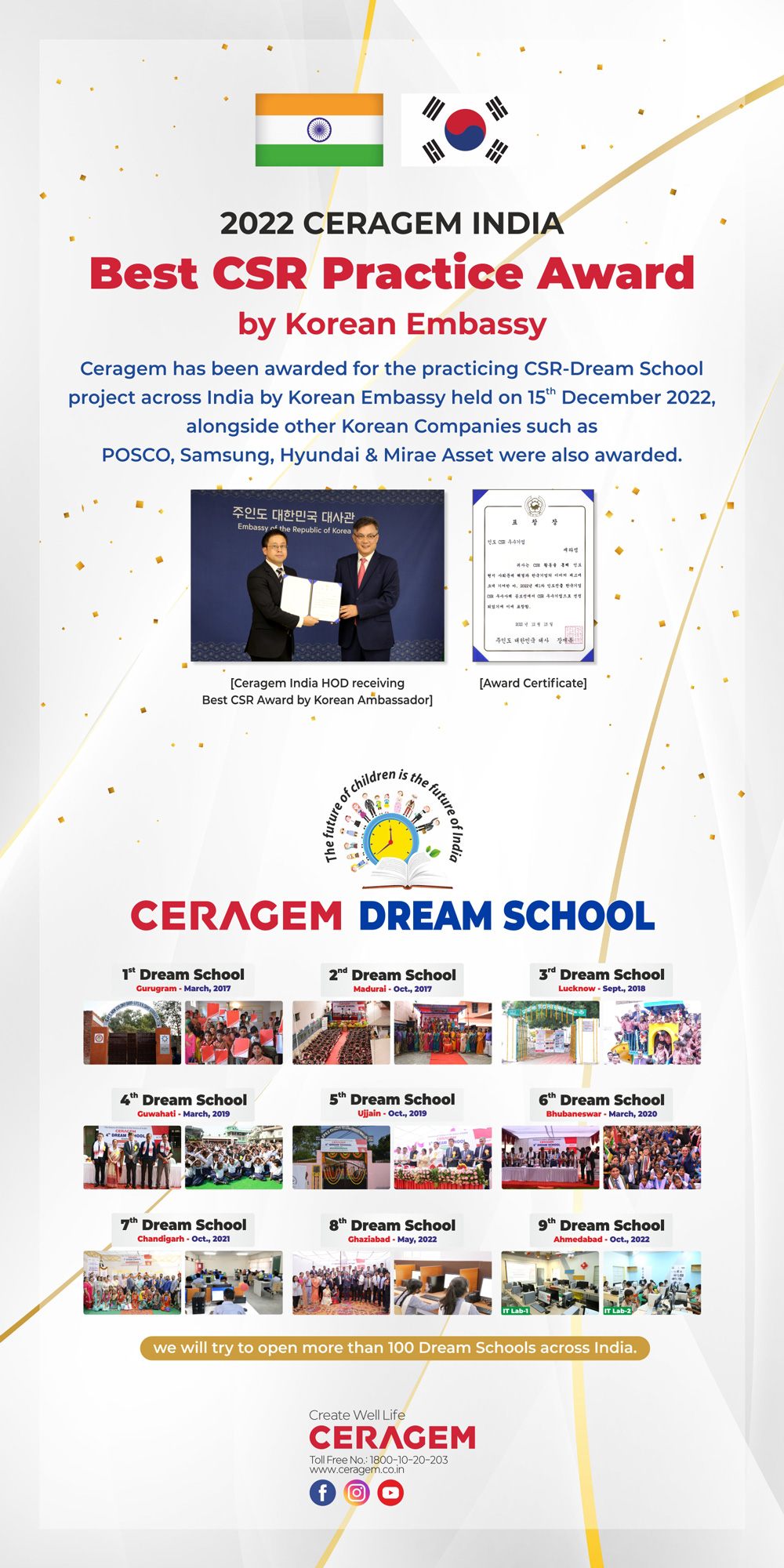 Ceragem has been awarded for the practicing CSR – Dream School project across India by Korean Embassy held on 15th December 2022, alongside other Korean Companies such as POSCO, Samsung, Hyundai & Mirae Asset were also awarded.