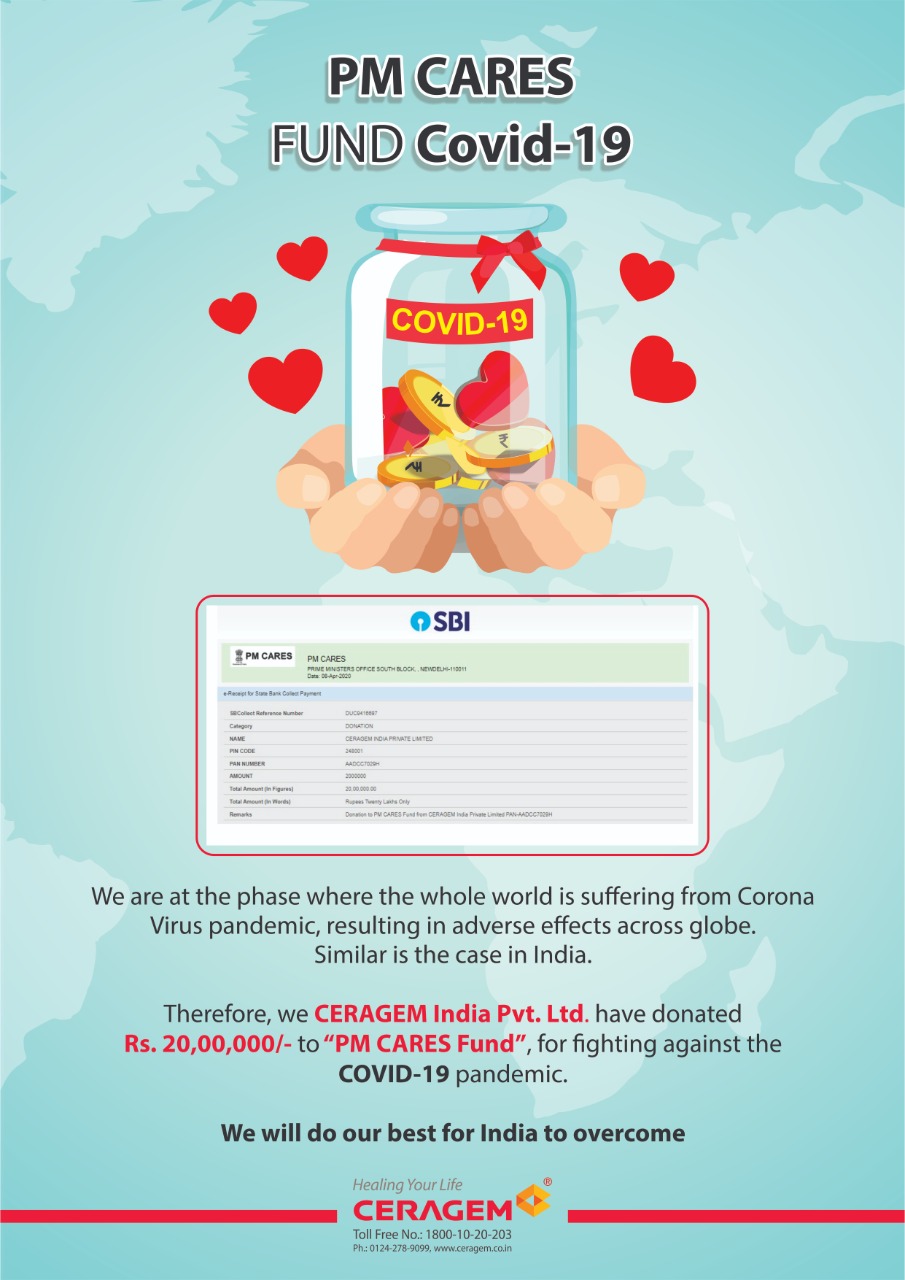 Therefore, We Ceragem Indian Pvt. Ltd. have donated Rs 20,00,000/- to “PM Cares Fund”, For fighting against the Covid-19 pandemic.